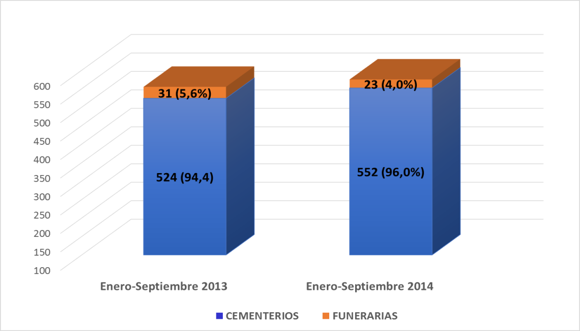 Un total de 575 reclamos contra el mercado de Cementerios y Funerarias ha recibido el Servicio, entre enero y septiembre de este año, lo que significa un aumento de 3,6% e en comparación a igual período del año anterior. De este total de reclamos, el 96% se concentra en cementerios, mientras que el 4% en funerarias.