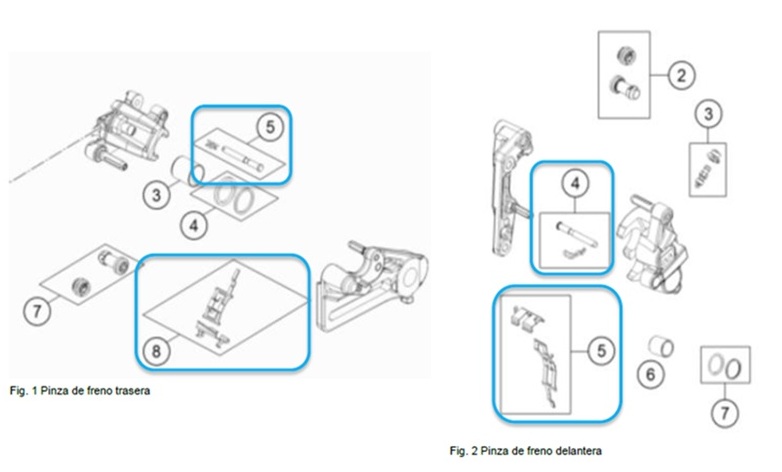 Debido a diferencias en los procesos de fabricación de los proveedores, puede ocurrir que en los modelos se haya ensamblado una pinza de freno incompleta. Podrían faltar chapas, resorte, pernos o pasadores de aletas, marcados en azul. Por esta razón, se debe comprobar si están completas las pinzas de freno, delanteras y traseras, de todas las motocicletas afectadas.