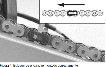 La medida de reparación consiste en la sustitución de la cadena de accionamiento por un componente que cumple con los estándares de calidad y resistencia requeridos. Durante este proceso, se pone especial atención en la instalación del eslabón de unión, asegurando que el extremo cerrado del clip de cierre esté orientado hacia el sentido de giro de la marcha; esta disposición técnica es crítica, ya que evita que el clip pueda soltarse accidentalmente por fricción o contacto con elementos externos, garantizando así la máxima seguridad y durabilidad del sistema de transmisión.