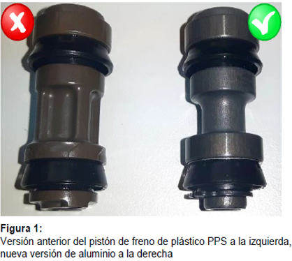 Debido a una posible debilidad del material del pistón de freno, se puede producir una fisura en el pistón de freno bajo cargas pesadas, como en el uso de competición, o en caso de frenadas frecuentes dentro de la gama de regulación del ABS. De esta manera, se puede reducir el efecto de frenado, lo que podría provocar un posible fallo en el freno de la rueda delantera.