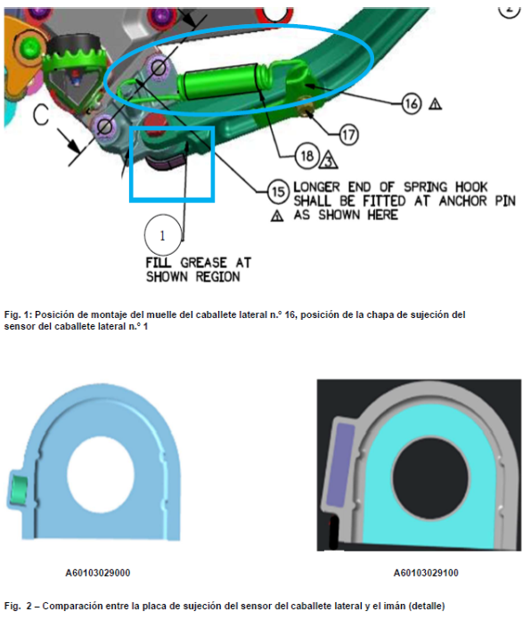 La empresa informa que se ha detectado que las vibraciones del motor pueden provocar la rotura por vibración del muelle del caballete lateral en los caballetes laterales forjados. Por lo tanto, KTM AG recomienda sustituir el muelle del caballete lateral por uno nuevo que incluya una