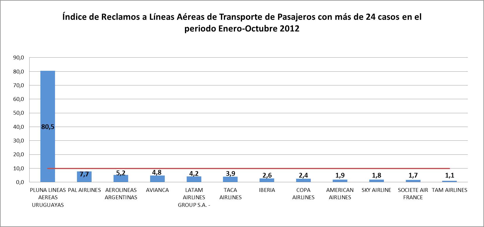 El ranking1 de reclamos lo lideró la aerolínea uruguaya Pluna, con un índice de 80,5 puntos, esto quiere decir que por cada 10.000 pasajeros esta compañía registró 80 reclamos.