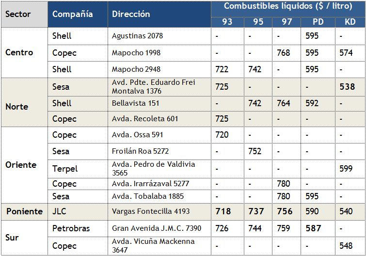 Revise los precios mínimos y máximos por tipo de gasolina y por estación de servicio, según sector de la Región Metropolitana, para la semana del 13 de noviembre de 2012.