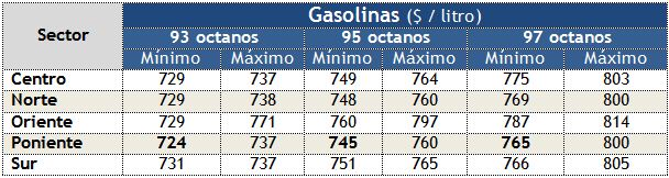 Precios mínimos y máximos por tipo de gasolina, según sector del área metropolitana, al 10 de diciembre de 2012