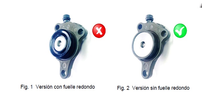 La empresa informa que se han detectado daños en la junta debido a diferencias en el montaje, lo cual podría afectar el correcto funcionamiento del cilindro receptor del embrague. Por esta razón, se requiere la sustitución de todos los componentes de la versión actual que incluye un fuelle redondo (tal como se ilustra en la figura 1), por la nueva versión que no lo incluye (referida en la figura 2).